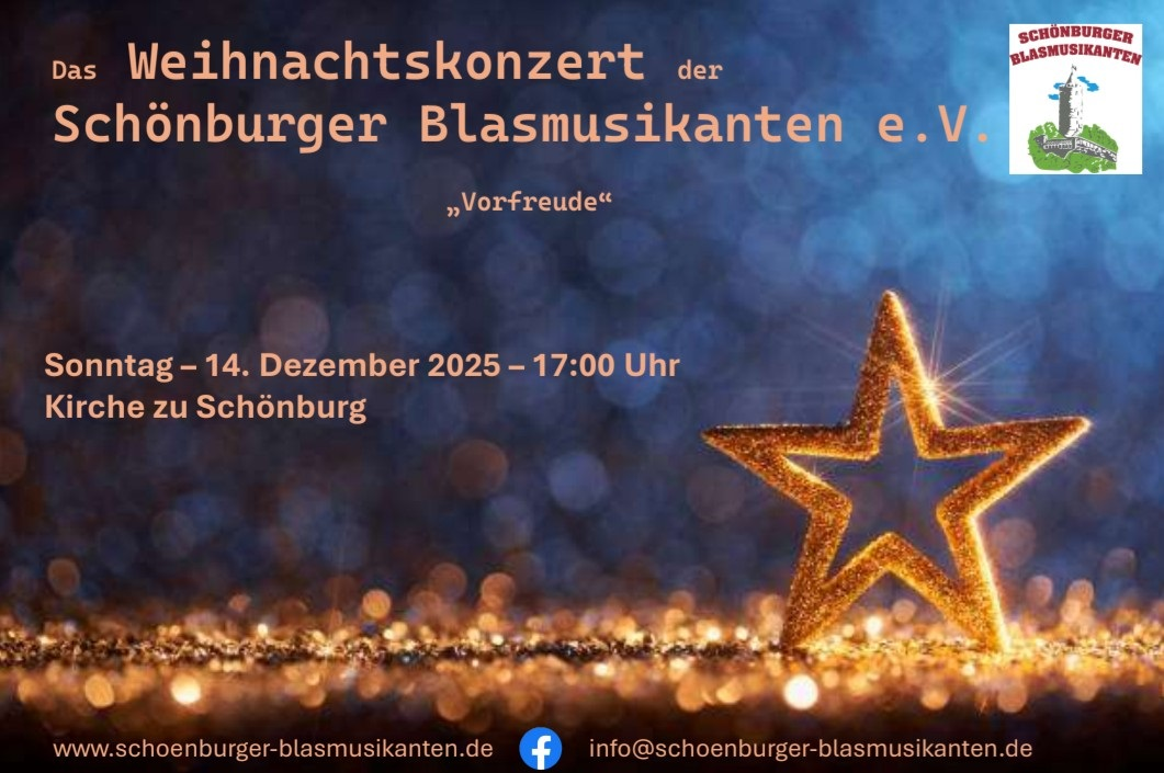 Weihnachtskonzert der Schönburger Blasmusikanten e.V. Am Sonntag, den 14.12.2025 ab 17:00 Uhr findet in der Kirche zu Schönburg das Weihnachtskonzert der Schönburger Blasmusikanten e.V. statt. Datum: 09.12.2025