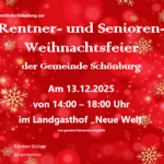 Rentner- & Senioren-Weihnachtsfeier der Gemeinde Schönburg Am Samstag, den 13.12.2025 von 14:00 Uhr bis 18:00 Uhr findet im Landgasthof "Neue Welt" die Rentner- und Senioren-Weihnachtsfeier der Gemeinde Schönburg statt. Datum: 09.12.2025